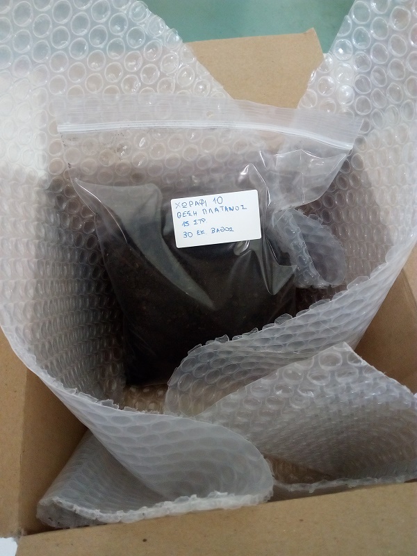 Η αφαιρεθείσα ποσότητα τοποθετείται σε πλαστική σακούλα. Επισημαίνουμε την σακούλα με τον ανεξίτηλο μαρκαδόρο γράφοντας το επώνυμο του αποστολέα, την ημερομηνία και τον αύξοντα αριθμό του δείγματος (αν για παράδειγμα είναι το τρίτο από πέντε δείγματα που θα στείλουμε, γράφουμε στην σακούλα “3από5”).